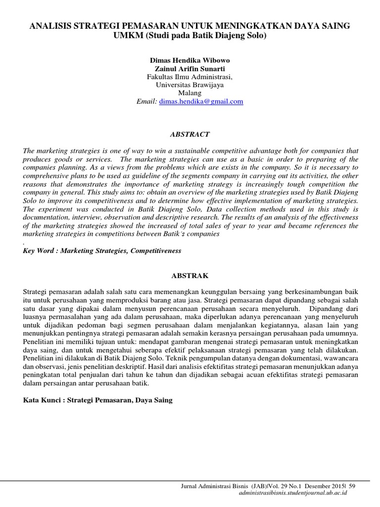 1113046000056 analisis strategi pemasaran dalam meningkatkan volume penjualan. Analisis dan strategi peningkatan daya saing tuna olahan indonesia di pasar internasional merupakan hasil karya sendiri di bawah arahan dari komisi pembimbing dan belum pernah diajukan untuk memperoleh gelar pada program sejenis di perguruan tinggi lain serta belum pernah dipublikasikan. Dimas hendika wibowo arifin zainul dan sunarti. Berdasarkan latar belakang di atas maka skripsi ini mengambil judul analisis strategi pemasaran untuk meningkatkan daya saing umkm studi kasus pada batik diajeng solo 2.