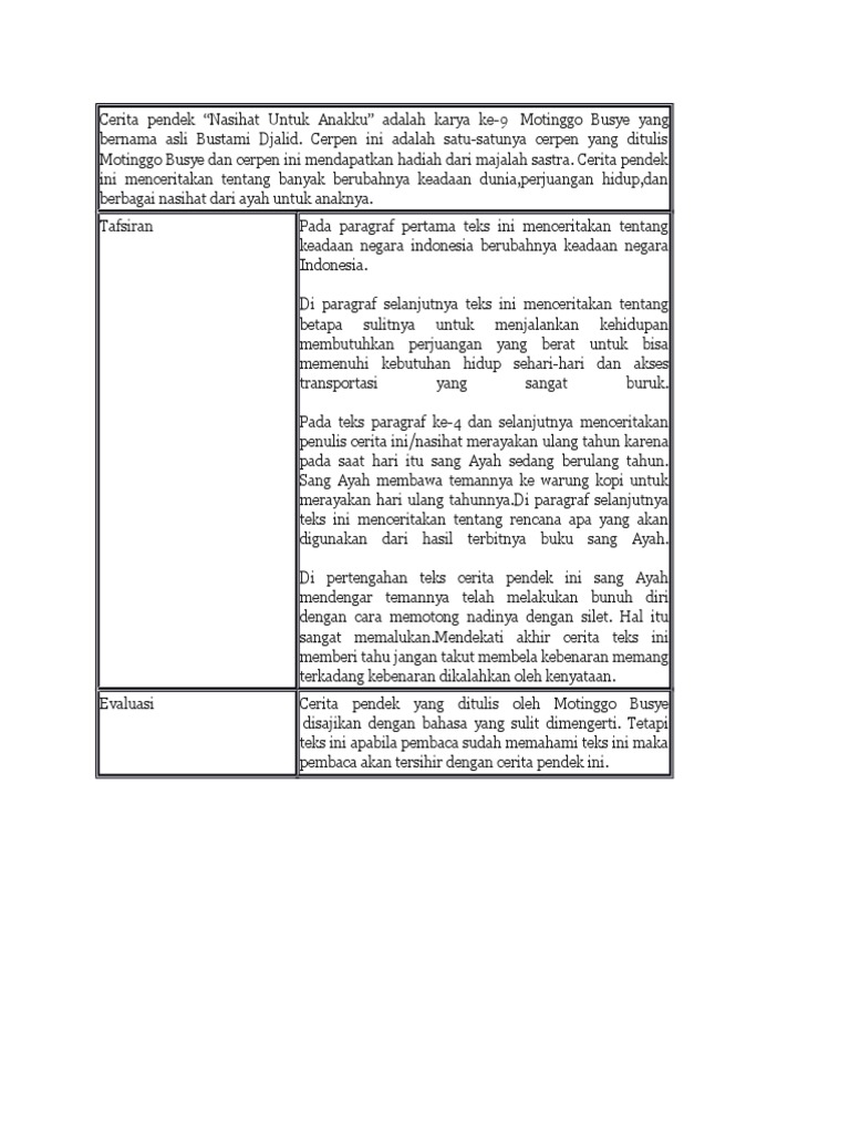 Isi cerpen sangat baik dan penuh dengan moral anak anak dapat termotivasi untuk mencontoh dan menerapkan nasihat nasihat itu dalam kehidupannya. Tugas bahasa indonesia ulasan cerpen nasihat untuk anakku karya motinggo busye. Cerita pendek nasihat untuk anakku adalah karya ke 9 motinggo busye yang bernama asli bustami djalid. Beberapa cerita yang didadarkan motinggo busye tak terkesan rumit meski kerap dilatari persoalan hubungan yang berantakan.