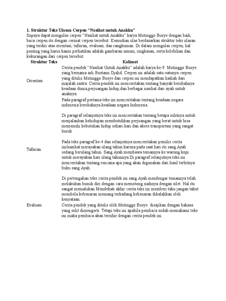 Cerpen nasihat untuk anakku adalah cerpen yang ditulis oleh motinggo busye. Kalimat berisi keunggulan buku untuk melengkapi teks tersebut adalah. Nasihat untuk anakku ini ditulis oleh motinggo busye cerpen ini ditulis pada tahun 1962. Tiap kelompok terdiri atas 3 5 siswa.