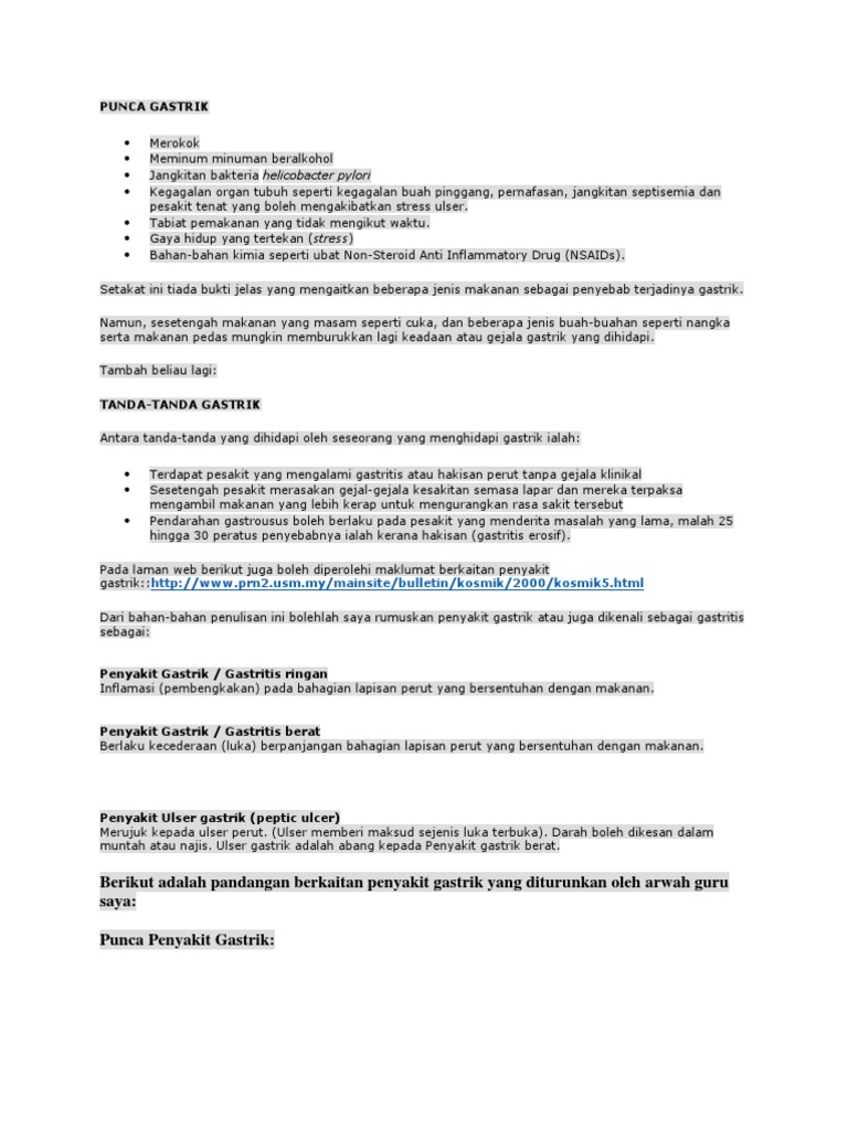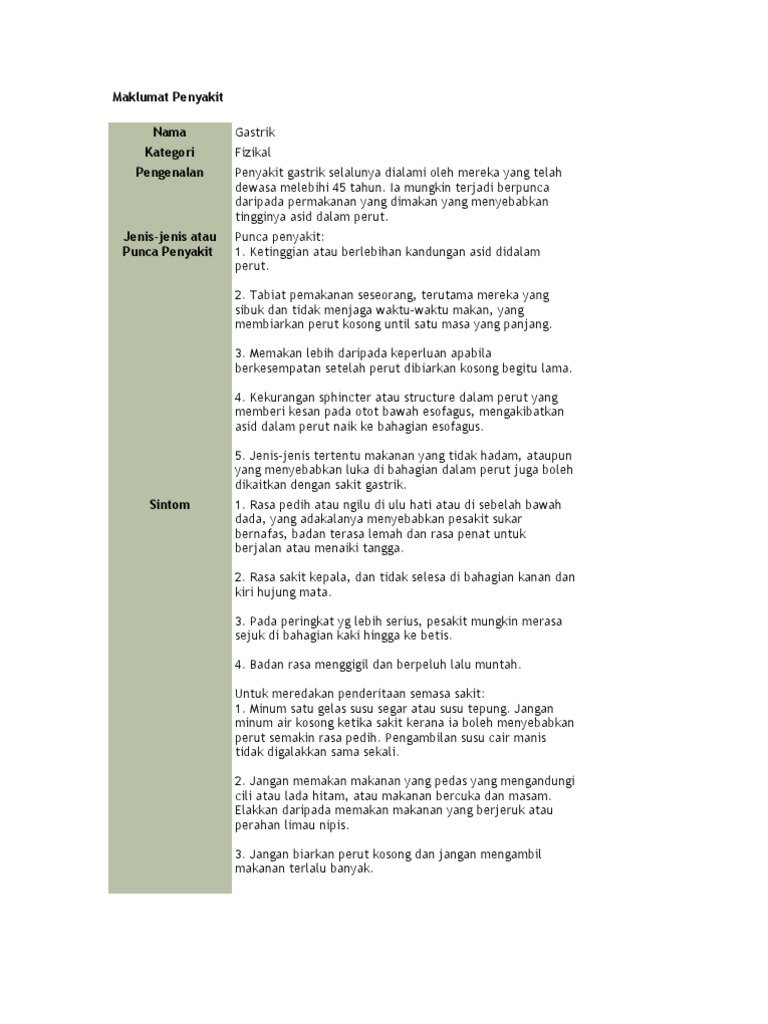 Gastritis atau penyakit gastrik yang dikenali umum adalah satu penyakit yang dikaitkan dengan pedih atau sakit di bahagian perut atau ulu hati penyakit gastrik adalah keradangan yang berlaku di lapisan permukaan perut. Ia datang tanpa sebarang isyarat. Melainkan yang memang jenis menjaga pemakanan jenis cool bila berfikir dan mempunyai persekitaran yang sangat menenangkan bak kata orang kau ni macam tak ada masalah seumur hidup ada ke. Aduh sakit kepala berdenyut denyut tiba tiba.