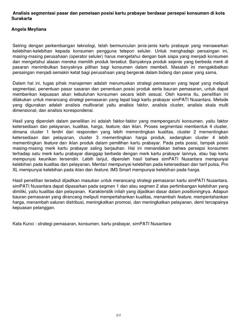 Abstrak Analisis Segmentasi Pasar Dan Pemetaan Posisi Kartu Prabayar Berdasar Persepsi Konsumen Di Kota Surakarta