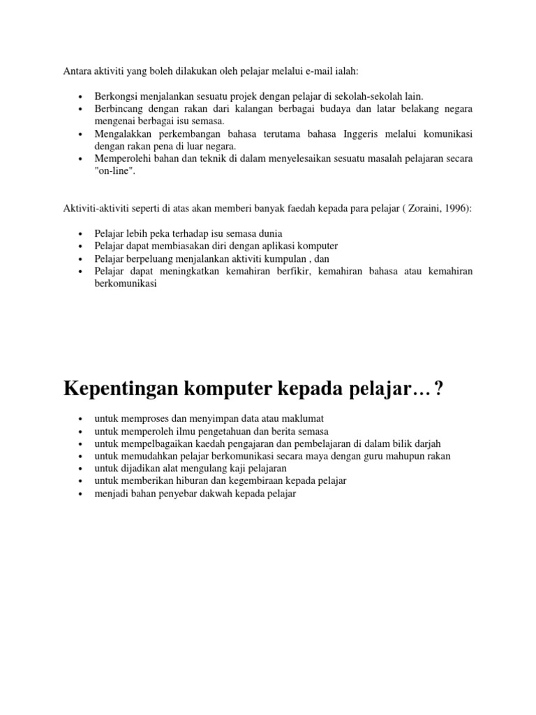 Komputer adalah alat elektronik yang banyak digunakan pada masa kini. Karangan faedah bersukan kepada pelajar. Komputer telah banyak berjasa kepada kami kerana ia boleh mengurangkan kerja kerja kami yang akan mengambil lebih masa dan tenaga tanpa. Di malaysia penggunaan komputer begitu popular tidak kira peringkat usia sama ada murid sekolah pelajar universiti atau pun yang sudah bekerja.