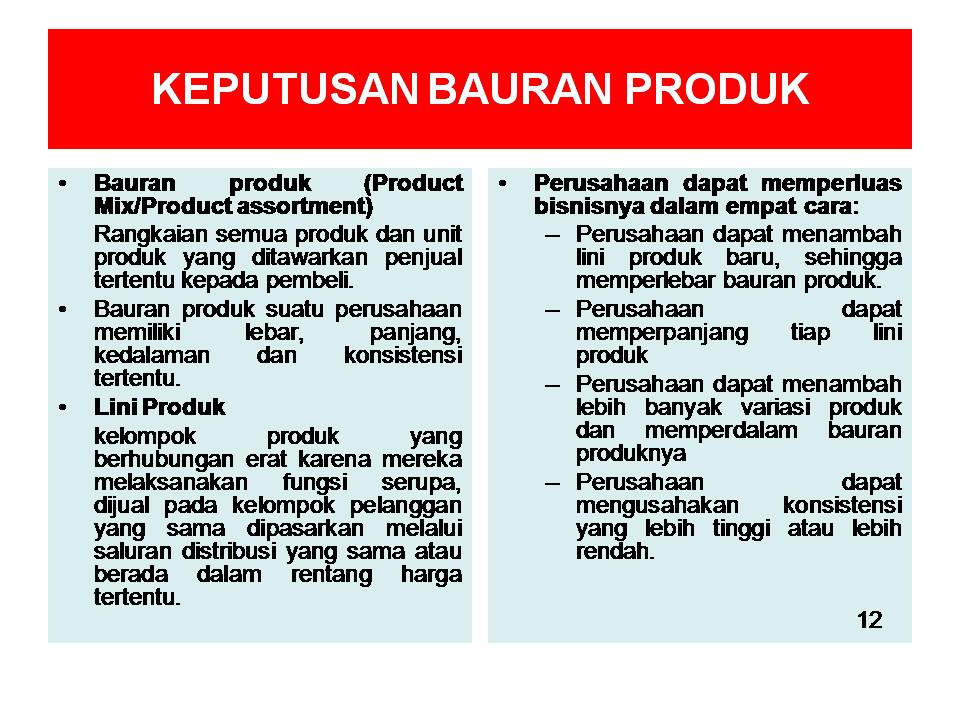 Klasifikasi bauran dan lini produk. Bauran produk product mix juga disebut product assortment. Lini produk dan bauran produk merupakan satu kesatuan dimana lini produk merupakan bagian dari bauran produk. Memasarkan lebih dari 8500 merek dan 30 000 produk nestle. Produk adalah hasil proses produksi yang dilakukan oleh produsen atau perusahaan yang nantinya akan dijual kepada konsumen yang membutuhkan atau dapat juga dikatakan suatu barang jasa yang memiliki nilai tambah atau memberikan kemanfaatan bagi penggunanya yang dihasilkan dari proses produksi.