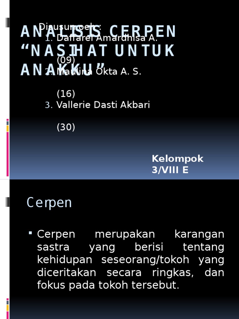 Cerpen ini menceritakan tentang nasihat seorang ayah kepada anaknya tentang perjalanan terjal seorang pengarang dalam menghadapi kerasnya hidup. Jalan cerita hanyalah perwujudan bentuk wadah bentuk jasmaniah dari plot. Analisis cerpen nasihat untuk anakku ppt download. Cerpen ini adalah satu satunya cerpen yang ditulis motinggo busye dan cerpen ini mendapatkan hadiah dari majalah sastra.