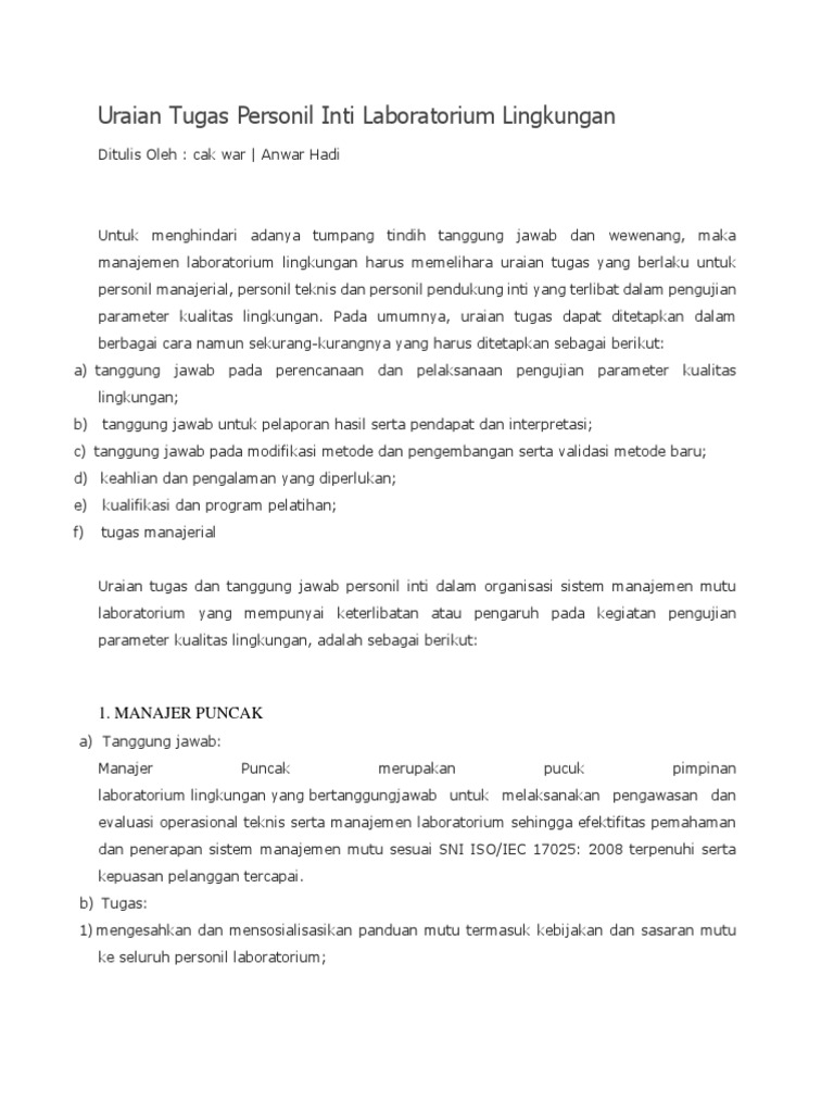 Uraian Tugas Personil Inti Laboratorium Lingkungan