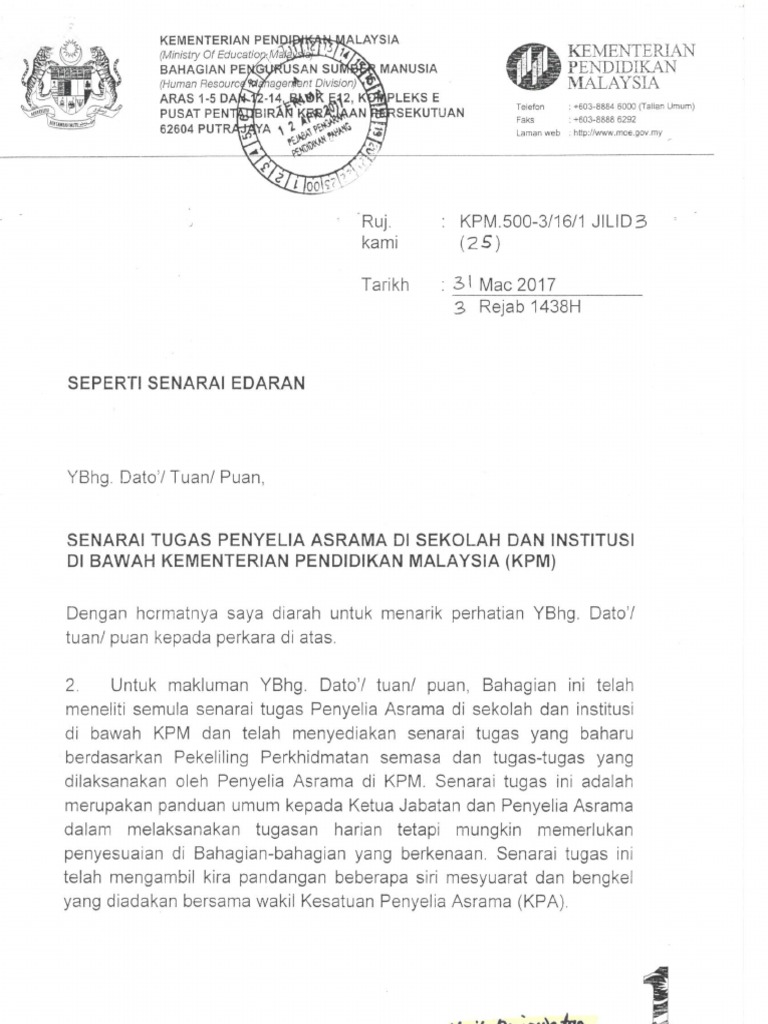 Panduan Waktu Bekerja Huraian Senarai Tugas Penyelia Asrama