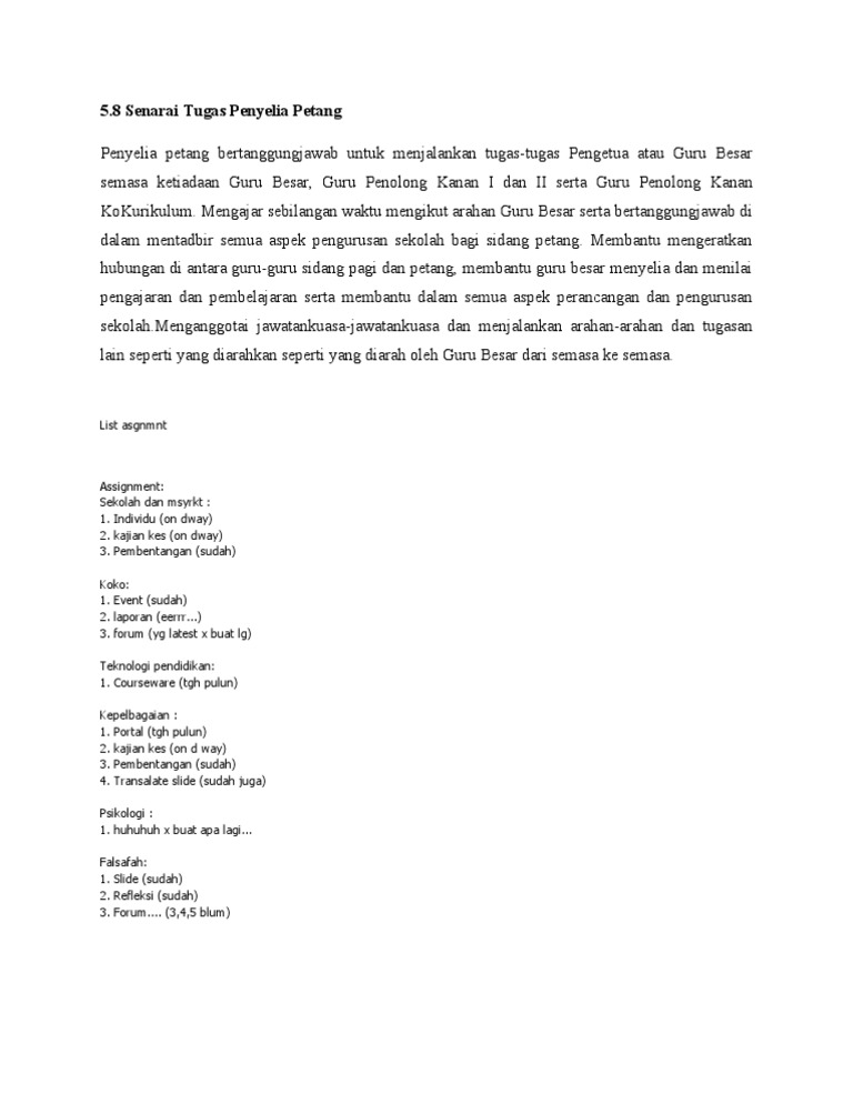 Tugas penyelia petang. Skop fungsi dan bidang tugas ikut pekeliling penyelia petang penulis admin. Pada tahun 2016 kementerian menerbitkan dokumen awal deskripsi tugas pegawai perkhidmatan pendidikan laluan pengajaran pembelajaran dan kepimpinan berdasarkan bidang keberhasilan utama jawatan yang disandang pegawai perkhidmatan pendidikan ppp mengikut gred. Guru penyelia petang bertanggungjawab kepada guru besar dalam mentadbir sekolah sesi petang. Merancang menyusun program kurikulum taska.