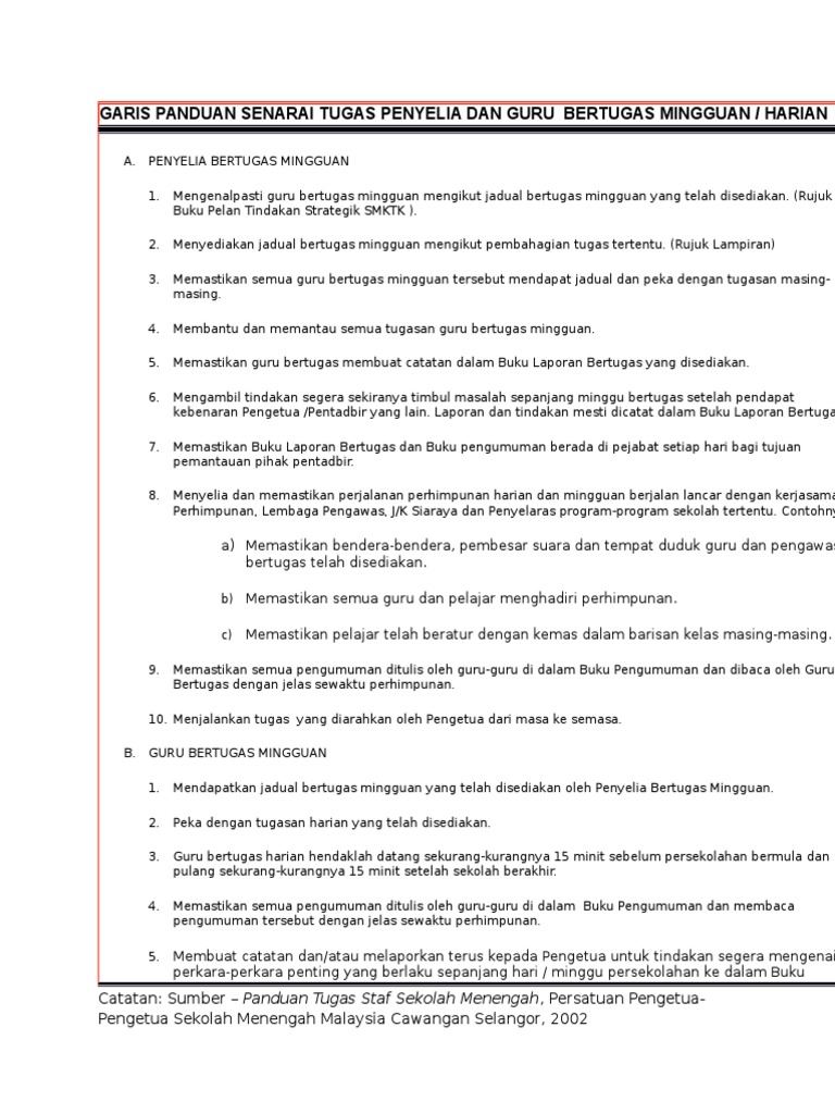 Garis Panduan Senarai Tugas Penyelia Dan Guru Bertugas Mingguan