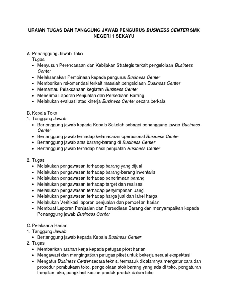 Uraian Tugas Dan Tanggung Jawab Pengurus Business Center